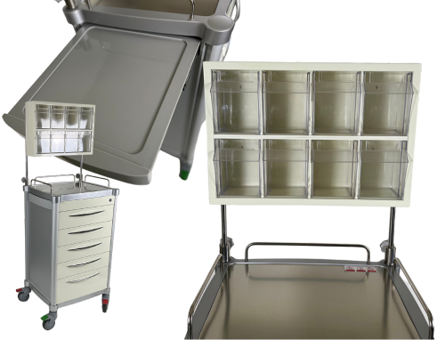 上部にはクリアタイプの多段ボックスを搭載し、薬剤や麻酔器具を視認性高く整理・分類できます。